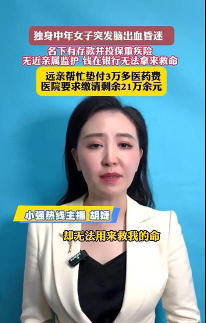 有网友表示:“以后这样的事情还会有的!”另一位网友表示:“这就是不结婚、不生孩子的后果。人生病、老了,身边没有丈夫,也没有其他亲人,可以说老了很乱。”刚刚。当天,上海46岁江女士突发脑溢血引发热议。现在后续来了:46岁的姜女士,单身,没有孩子。他的父母已经去世,他没有亲人。没有人报名参加这项行动。居委会作为监护人,不能提取治疗费用。本文所述内容有可靠信息来源,详情见文末。案情简述: 46岁的蒋女士家住上海。他有稳定的工作,属于高收入群体。蒋女士,大学士。 46岁的他依然没有妻子或孩子。他总是一个人住。然而,2025年10月14日,姜女士给公司领导发信息称,自己头晕,无法动弹,需要请假。公司领导接到姜女士的信息后,派同事前往查看情况,并将姜女士送往医院。经医生检查,姜女士并非普通感冒,而是出现脑出血症状,需要立即手术。此时,女士的意识已经相当清醒了。蒋.当医生告诉她手术必须由家人签字时,江女士陷入了两难的境地。江女士的父母已经去世,他的祖父母也去世了。一位叔叔三十岁左右就去世了,兰州还有一位阿姨,今年四月份去世了。蒋女士身边总共没有亲戚可以代签。想了想,女士终于想起来了。江先生是他的远房亲戚吴先生。多么遥远这是远房亲戚吗?江女士的父亲为吴先生祖父的兄弟的儿子。吴先生与江女士之间没有任何联系。他们每年只在除夕夜聚在一起吃一次晚餐。吴先生了解江女士的病情后,立即赶到医院签订合同,并向江女士的公司垫付了3万元医疗费。江先生,给江女士看病。然而,江女士的病情逐渐恶化,并伴有烟雾综合症,神志不清。现在他住在重症监护室,只能靠呼吸机维持生命。从住院到11月11日,累计医疗费21万元。由于吴先生是江女士的远房亲戚,医院无奈只能联系吴先生付款。但事实是,吴先生无力承担如此高额的医疗费用,而且他与江女士是远亲,没有合法继承关系。如果条件江女士日后,吴先生可以用江女士的财产清偿债务。在这种情况下我们该怎么办?先生咨询道。吴先生向律师求助,律师告诉吴先生,按照姜女士的情况,由当地居委会来担任监护人比较合适,所以他无奈只能向姜女士当地的居委会寻求帮助。蒋.接到吴先生的求助后,居委会立即向派出所申请询问姜女士是否还有其他亲属。经查询发现,姜女士的亲戚是其姑妈在兰州的孩子。至于对方是否愿意承担监护人责任,目前尚未得到回应。居委会也表示,将积极承担起照顾保护责任,支持江女士。但事实是,居委会作为姜女士的监护人,想用姜女士的工资。蒋和批判疾病保险用于支付住院费用。居委会工作人员无论联系银行还是保险公司,得到的答复都是:居委会没有这个权利。这意味着,居委会作为姜女士的监护人,无权动用姜女士工资银行里积累的钱来支付这笔费用,更无权动用姜女士的大病保险。一方面,医院以监护人的身份督促居委会尽快缴费。另一方面,银行和保险认为自己没有这个权利,所以这件事就陷入了僵局。最终,居委会工作人员只能向法院申请宣告姜女士为无民事行为能力人或限制民事行为能力人,并指定姜女士的监护权。只有完成相关手续,社区委员会才能成为女士的监护人。坚g 并行使监护权。所幸,经过医院全力救治,姜女士已脱离生命危险。如果他可以单独签字或者哈,居委会是否接管护理责任取决于女士的康复情况。蒋.以上就是故事的全文。 46岁女士的事件被社交平台报道后。蒋先生,这很快引起了大家的热议:有网友认为:事实证明,不孝分三类,古话说无子嗣是正确的。随着年龄的增长,许多人可能会失去移动的能力。这个时候,即使有不配的孩子,也比没有孩子好吧?有网友认为:单身、没有孩子的朋友绝对可以仔细看看。不要以为一直一个人就好,不要给别人增加负担。但是,当您行动困难并需要护理时该怎么办?这个例子很励志。有网友表示:非——保险公司与银行的合作是非法的。认为如果女子没有得救,她的保险金和银行存款就会无主并被滥用?谁来管理它?如何实现监督?正如网友评论的那样,这可能是没有配偶的后遗症,而且以后这种情况会更加普遍。年纪越大,这种情况就越有可能发生。那么单身和不育的人应该怎么办呢?有网友建议,未婚不育的人应该学习江女士的事件,在什么年龄做自己想做的事。该结婚就结婚,该生孩子就生孩子。只有这样,当你老了的时候,你才会有安全感。当然,专业律师会提供建议。律师表示,这种情况今后将会变得更加普遍。律师建议国家有关部门设立专项紧急救助资金。此外,律师还建议单身人士应尽快建立自愿护理模式,让他们在面对突发事件时不至于束手无策。你对此有何看法?如果您有什么想说的,欢迎在评论区留言讨论。 【免责声明】文中描述的流程及图片均来自网络。本文旨在弘扬社会正能量,杜绝脏话等不良引导。如有版权或文字侵权问题,请及时联系我们,我们将尽快删除内容!如果您对该事件有任何疑问,请立即联系删除或进行更改。信息来源:小强热线—浙江教育科技STV新闻工作室